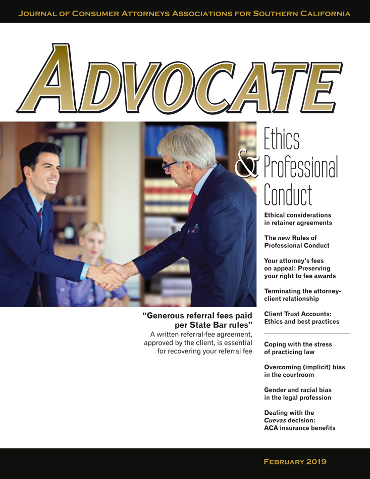 “Generous referral fees paid per State Bar rules” Written association of counsel and referral-fee agreements, approved by the clients, are essential for recovering attorneys’ referral fees David Hoffman From Issue: 2019 February