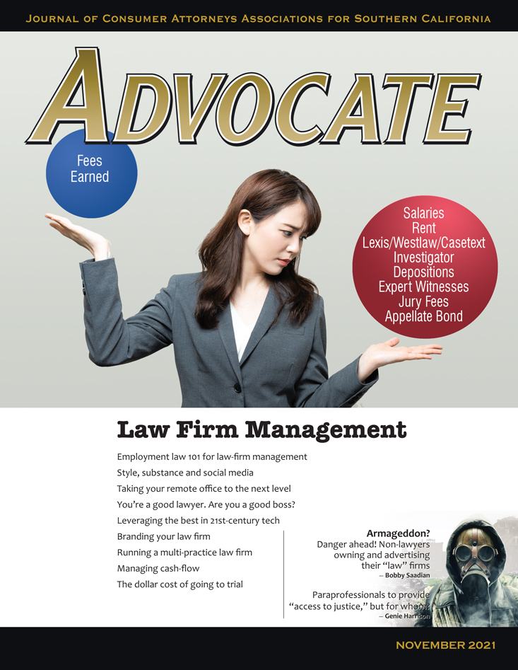 Danger ahead! Non-lawyers owning, operating and advertising their “law” firms with devastating consequences for both lawyers and their clients Bobby Saadian From Issue: 2021 November
