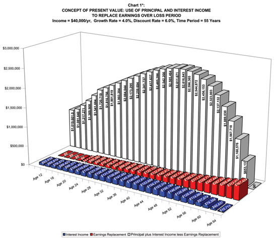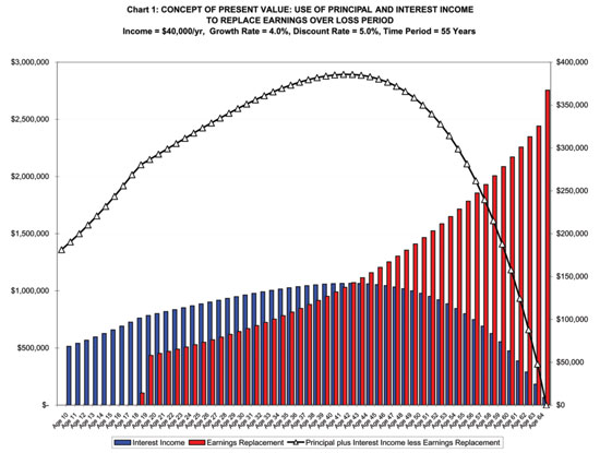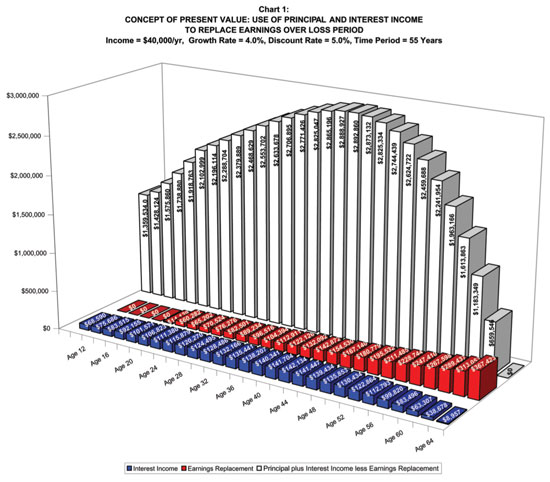 The goal of the above analyses has been to clarify the concept of present value and show how it changes depending on the quantification of the individual building blocks. As explained, economists may agree on the concept of present value, but they continue to debate how the four building blocks should be valued. This article does not attempt to resolve that debate, but to provide insight into how the initial present value awarded by the jury will serve to replace the stream of earnings that have been lost or provide for future medical expenses. This is a concept that is not easily understood when verbally articulated to the jury. The three dimensional charts included in this article visually demonstrate the concept of present value and may assist attorneys in explaining present value calculations to the jury. The appendix to this paper includes the same charts in a two-dimensional format, which measures the changing principal “balance” on the left axis and the interest income “cash inflow” and wage replacement “cash outflow” on the right axis.