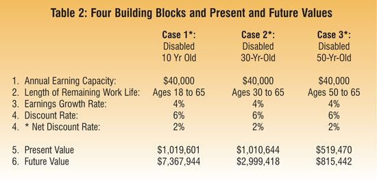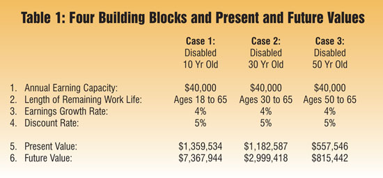 For simplicity in presentation, each example will assume an earning capacity of $40,000 per year, a worklife to age 65, an earnings increase rate of 4 percent and a discount rate of 5 percent. Table 1 shows these assumptions and the corresponding present and future values for each situation.