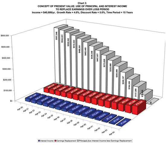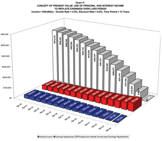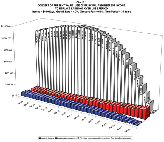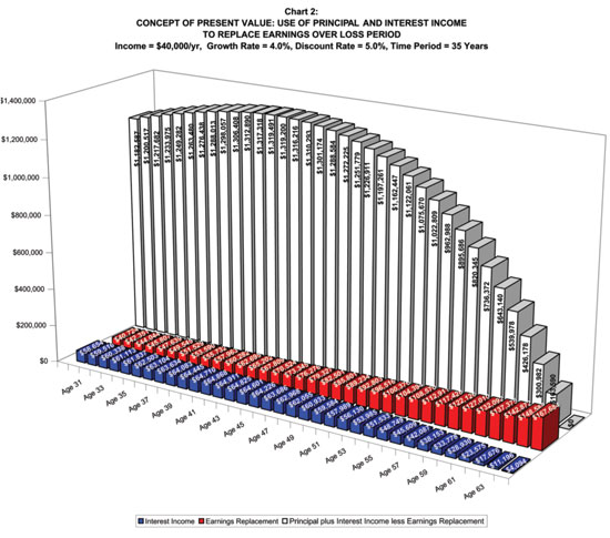 Charts 1 and 2 demonstrate that the longer the future loss period measured from the present, the principal invested must grow for a longer period of time in order for there to be sufficient principal to replace the earnings near the end of the work life. An inspection of Chart 1 shows that once the earnings replacement begins, the principal invested begins to increase at ever slower rates until reaching a peak. Once it peaks, however, in both Charts 1 and 2, it begins to decline at ever greater rates until the principal goes to zero at age 65. An understanding of this process of growth and decline of principal is important because it demonstrates that in matters where the projection period is “long,” the interest income must be greater than the annual wage replacements for many years; otherwise there would be insufficient principal to replace the loss in the latter years of the loss period.