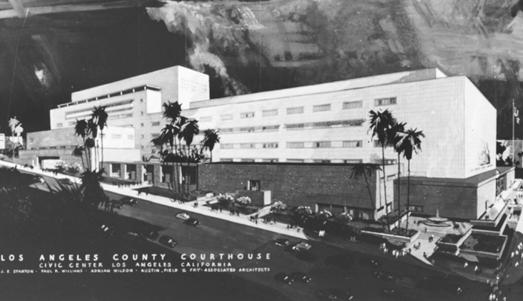 In 1951, the County Board of Supervisors appointed architects John C. Austin, Paul R. Williams, J.E. (Jess) Stanton, Adrian Wilson, and the firm Austin, Field & Fry to design a “combined courts building.” The County awarded the construction contract to the low bidder, Gust K. Newberg Construction Company.