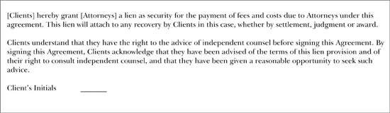 Protect your fee in the event you are discharged by including an attorney’s lien provision in your fee agreement. (See example in Appendix A.) An attorney’s lien – also called a charging lien – is created only through contract with the client. In a contingency fee agreement, the attorney’s lien formalizes the plaintiff attorney’s interest in his client’s recovery. The contingency attorney’s lien provision simply states that he has the right to recover his contractual attorney fees and litigation costs advanced through the client’s recovery. Ordinarily, the attorney’s lien is not an issue – assuming there is no dispute with the client over fees and costs. But the attorney’s lien protects the value of the attorney’s services in the event he is discharged or withdraws for “good cause.”