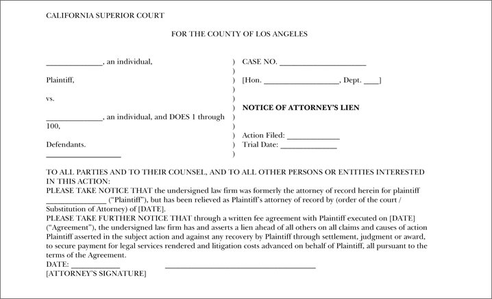 If you are discharged as plaintiff’s attorney, serve a notice of lien on plaintiff and his new attorney, counsel for all parties, and all other interested parties known to you. (See Example in Appendix B.) File the Notice of Lien with the proof of service. In addition, send plaintiff’s new attorney an itemized detail of all litigation costs advanced.