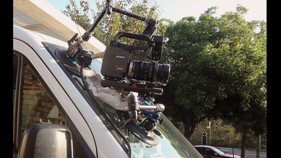 If side windows and mirrors must be included, two or three professional cameras are mounted pointed at different angles in the head position and the several images spliced together during computer editor processing.