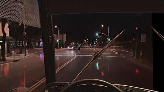 We were not able to schedule an exemplar city bus and traffic in advance when we knew there would be a rainy night. How, then, did we get the bus drivers’ eye view, at 16mph, rain hitting the windshield, wipers working, wet streets, striking a pedestrian running across 3 lanes from the left?