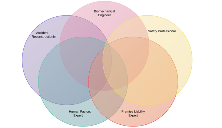 Assuming you glance through one of these resources, you find a variety of different kinds of experts. But what exactly is a Biomechanical Engineer versus a Human Factors Expert versus a Safety Professional? What is an Accident Reconstructionist? When would you want a Property Management Expert? Some of these designations overlap, and sometimes different kinds of experts can testify to the same facts, but for different reasons. This overlap is visually illustrated in the following Venn diagram. The remainder of this article delves into these expert designations.