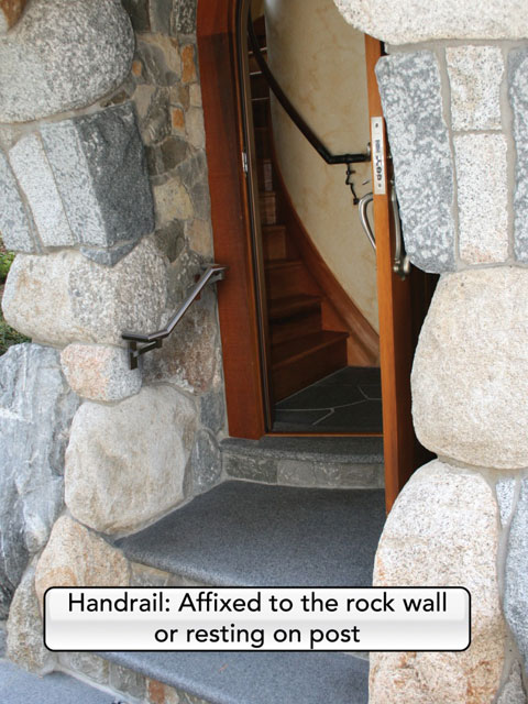 The stairway consists of three steps total, none of which is uniform with any other. The first step is rectangular in shape, with boulders encroaching the tread for several inches on either side; the second step is unusual in that it meets neither the CBC requirements for a landing nor for a step, and its shape is best described as an irregular rectangle with a concave curve at the far side; and the third step is a curved step to the threshold of a round top door. Neither the door nor the third step are parallel to the nosing of the first two steps (or step/landing) but rather are canted at a 22.5 degree angle away from the plane of the steps.