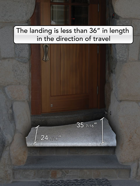 Here, the irregularly-shaped landing does not comport with the dimensional length requirements of the Code. The Code requires a consistent and uniform minimum 36 inches in length in the direction of travel for the entire landing space in front of the door. This landing varies in a concave arc from roughly 24” on the left side to 35” on the right. (See detail 5 on CAD drawings, attached hereto as Exhibit 1.) This dimensional irregularity is not what a user of the stairs would expect, thereby creating potential confusion and disrupting one’s gait. Therefore, the landing is not code-compliant and further contributes to the unsafe condition of the stairs.