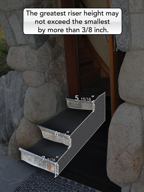 Section 1003.3.3 provides: “Rise and run. The rise of steps and stairs shall not be less than 4 inches nor more than 7 inches. The greatest riser height within any flight of stairs shall not exceed the smallest by more than 3/8 inch.” (2001 CBC Section 1003.3.3.) Thus, the greatest variance in height between any two risers may not exceed 3/8 inch. Here, the risers all vary from each other by amounts well beyond what the Code allows: