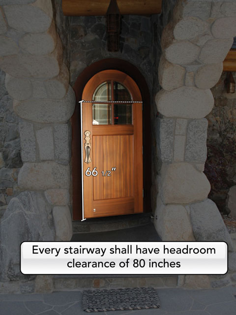 Because a step runs continuously along the stairway door, the 6-foot-8-inch headroom requirement applies at all points along the tread nosing at the threshold. The stairway does not meet the headroom requirement, because clearance at points where the rounded door begins its tangent (i.e. from an upward plane beginning at the right and leftmost points on the tread nosing) is only 66 and ½”, more than 14” lower than the Code minimum.