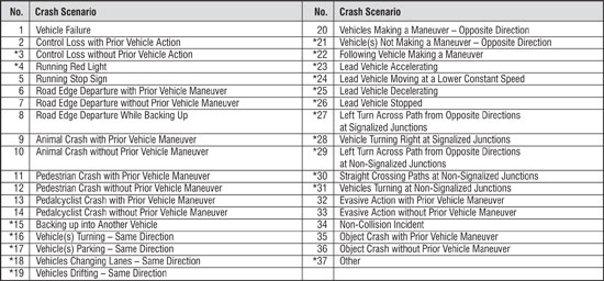 As part of its research and eventual implementation of technology, the US Department of Transportation conducted an analysis of annual number of crashes, and identified 37 Pre-Crash Scenario Types that needed to be addressed. (See Najm, Sen, Smith, and Campbell, (Nov. 2002) Analysis of Light Vehicle Crash and Pre-Crash Scenarios Based on the 2000 General Estimates System. Report No. DOT HS 809 573. Washington, DC: National Highway Transportation Safety Administration) (see chart on page 84).