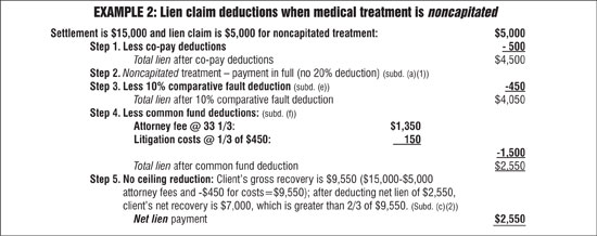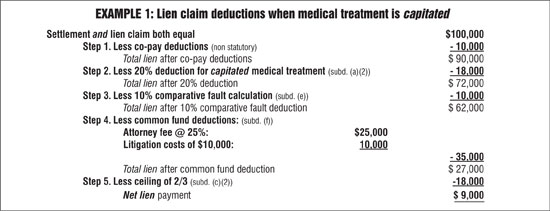 The statute does not specify any required order for lien-claim reduction, and there is no case law guidance. Therefore, chronological calculations using section 3040 statutory deductions need not be the same for all lien-claim negotiations. Two examples where section 3040 is used to reduce legitimate lien claims are shown above. These examples represent a very small set of facts out of endless settlement patterns. Note that the two examples apply the “five Cs” set forth above. The first example is based on a capitated lien claim; the second example uses a noncapitated lien claim.