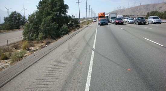 The trip point illustrated in Photo 1 is distinct and uniquely identified by the termination of tire friction marks (marked with orange painted dots). When in a yaw, a vehicle creates tire friction marks along an arc. The path of individual tires determines the vehicle’s yaw angle (the included angle between the vehicle’s CG velocity vector and the vehicle longitudinal centerline).