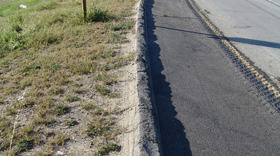 - Asphalt curbs – frequently associated with initiating a vehicle rollover. With a sufficient yaw angle, the wheel does not simply roll over the curb, but instead the curb becomes a tripping mechanism. Often, wheel strikes are evidenced by gouges to the asphalt or concrete, as shown in Photo 3 and Photo 4.