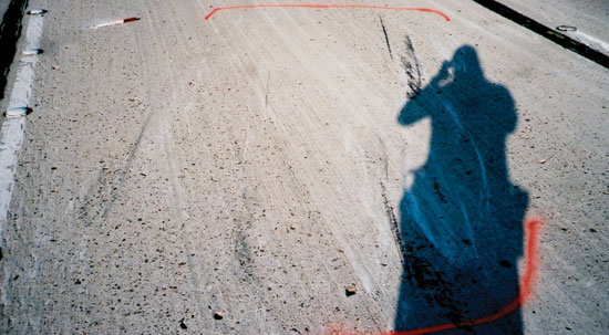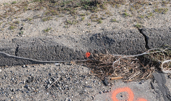 - Scrapes or gouge marks – Scrape or gouge marks are created by vehicle components interacting with the roadway. Scrapes may be considered linear and somewhat shallower, compared to gouges, and are caused by the vehicle exterior interacting with a road surface, shown in Photo 5 (under shadow). Gouges are characterized by a deeper artifact, with more road material removal. Scrapes or gouges soon after the collision are often denoted by their lighter appearance compared to the adjacent surface material. Scrapes tend to be longer near the start of the rollover trajectory by virtue of a higher linear velocity relative to the roadway. As linear velocity is reduced by friction with the road, the potential for longer scrapes is reduced. The location on the road, or the relative distance between groups of scrape marks, can assist in determining what portion of the vehicle created them.
