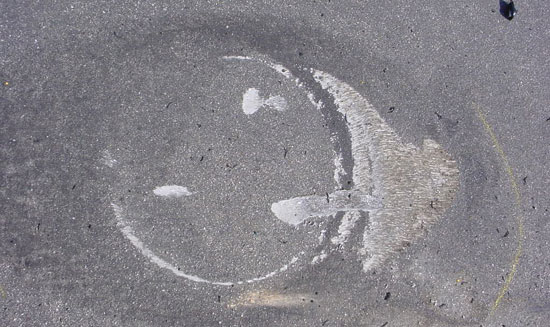 - Paint, plastic and rubber transfers – Paint transfers are caused when a painted portion of the vehicle contacts the roadway (black paint in Photo 5). A shallow scrape may be formed with a distinct color transfer corresponding to the exterior body color of the vehicle. Observing a paint transfer can assist in identifying the body panel and vehicle orientation at that location in the rollover sequence. Additionally, plastic transfers may occur when a plastic lens, trim piece, or side mirror contacts the road surface, as shown in Photo 12 (see page 104). Again, the position and color of a plastic transfer relative to other artifacts may assist in determining vehicle orientation when the plastic transfer was created. Rubber transfers mark the location where a tire contacts the road surface, as in Photo 13. Rubber tire transfers often reveal a striation pattern consistent with the tread belt or shoulder pattern.