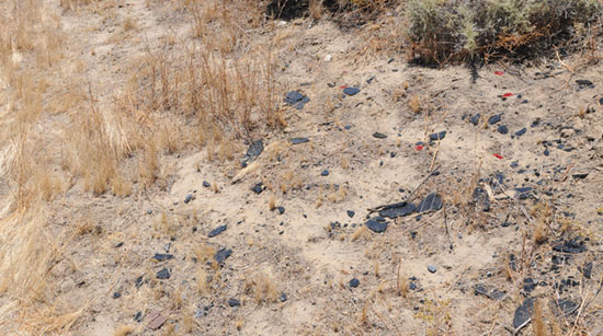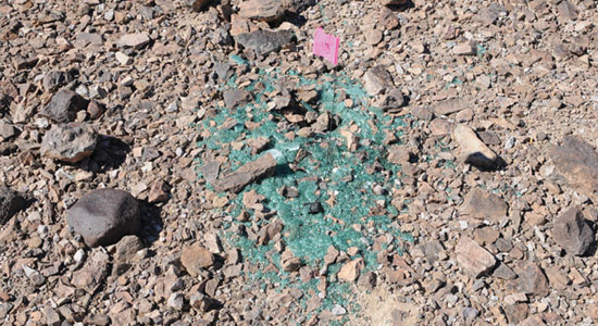 - Fractured glass – Fractured glass is often found along the vehicle’s roll path, shown in Photos 8 and 9. Vehicle window glass breaks due to impact forces or deformation to the vehicle’s structure. The thickness of these glass fragments can be measured with calipers, shown in Photos 10 and 11. The thickness, color and location of the glass fragments found can be cataloged. Comparing the glass fragments found at the collision site to those of the incident vehicle will help determine to which window the glass belongs, and more important, where in the rollover sequence the window fractured. Alternately, a suitable exemplar vehicle may be used when the incident vehicle is no longer available. Determination of the sequence of vehicle deformation sufficient to fracture window glass will help characterize vehicle orientation throughout the rollover sequence.