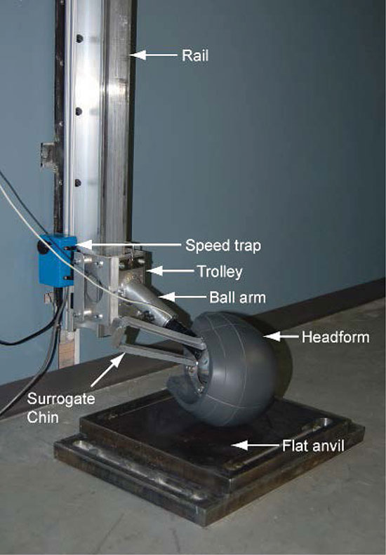 This test is done by placing a helmet on a metallic headform and impacting the helmeted headform at a prescribed speed onto an anvil, or impact surface, while recording the headform’s acceleration (Figure 1). The part of the helmet that attenuates head acceleration is the energy-absorbing liner, a foam layer typically made of expanded polystyrene (EPS) that crushes and cracks during impact and then partially rebounds after the impact. The crush that can be measured after an impact is referred to as residual crush. The liner protects the head by increasing the distance and duration over which the head decelerates and thereby decreases the peak acceleration experienced by the head. The liner crush also distributes the impact force over a larger area of the skull and thereby reduces the risk of skull fracture.