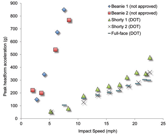A helmet’s impact attenuating capability is a key element of a biomechanical analysis comparing the effects of a certified and non-certified helmet. For example, consider a case where a vehicle and motorcycle collide and the motorcyclist, who was wearing a non-certified helmet (often called a beanie or novelty helmet), struck the roadway and sustained a skull fracture. A biomechanist can determine the head’s impact speed with the roadway, and then assess whether a certified helmet would have reduced the motorcyclist’s injuries. A non-certified helmet typically lacks an energy-absorbing liner or is fitted with an inadequate energy-absorbing liner. When impacted across a range of speeds, peak headform accelerations are much higher for a beanie helmet than for a certified helmet (Figure 2). Head impact speed when falling from a seated position on a motorcycle is about 13 mph. At this impact speed, a non-certified beanie helmet does not protect against a skull fracture while a certified helmet does. Although many real cases are more complicated, this simple example shows how a biomechanical analysis can be used to establish that the motorcyclist’s head injuries would likely have been prevented if he were wearing a certified helmet.