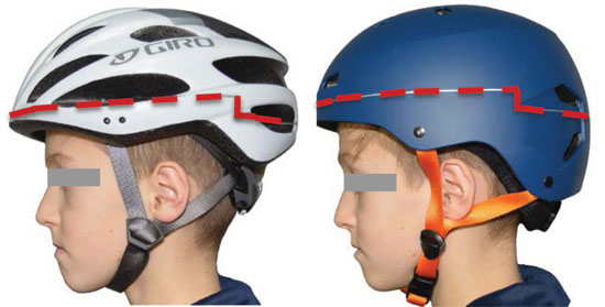 The impact testing protocols in most helmet standards are similar for a wide range of helmets and applications; however, the pass/fail criteria may vary depending on the helmet application. The peak headform acceleration allowed for bicycle helmets is 300g, whereas the peak acceleration for motorcycle helmets is 400g under similar conditions. Also, impact tests are only done to a specific region of the helmet above a “test line” prescribed by the applicable standard. The test line is measured from features on the headform and sits relatively high on the forehead and well above the tops of the ears (Figure 3). The test line location varies slightly between standards, and portions of the helmet that extend below the test line are not required to attenuate impacts. This means that a certified helmet may not prevent an injury located below the test line.