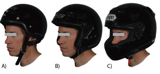 Different helmets cover different amounts of the head. For example, shorty-style motorcycle helmets have the least coverage of all certified motorcycle helmets, whereas full-face have the most coverage (Figure 4).