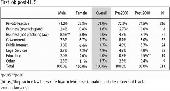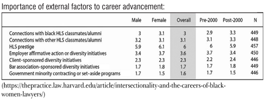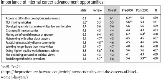 When looking at race and career advancement, the survey showed “interesting differences across eras, as black lawyers from the post-2000 period ranked having an influential mentor or sponsor and socializing with white peers as important at higher levels than their pre-2000 counterparts – though both view these factors as key.” (https://thepractice.law.harvard.edu/article/intersectionality-and-the-careers-of-black-women-lawyers/)