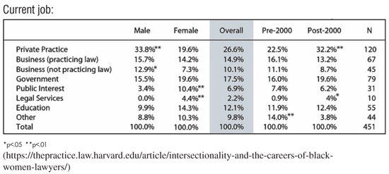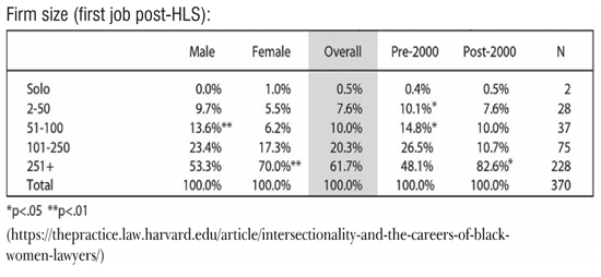 Looking at law firm partnership, black lawyers, men and women, continue to be drastically underrepresented. The average black partnership rate was 1.81 percent in 2016 and for black women, only 0.64 percent. In addition, the survey showed that for those still in private practice, many had migrated to small and midsize firms where they became partners. (https://thepractice.law.harvard.edu/article/intersectionality-and-the-careers-of-black-women-lawyers/)