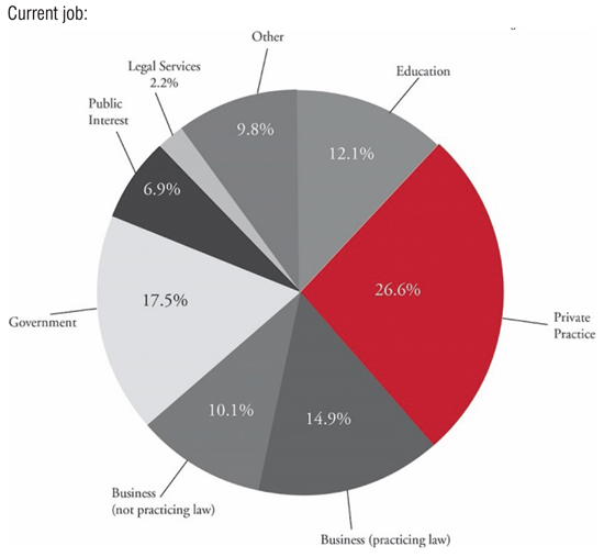 However, when looking at current jobs, there is a drastic migration – 63 percent out of private practice into other sectors, including government, public interest, and business. Adding the gender variable, black men were significantly more likely to remain in private practice than black women.