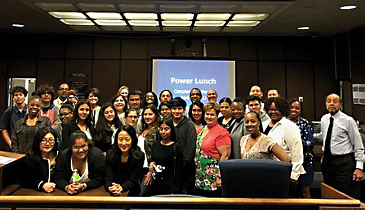 Power Lunches have featured such distinguished guest speakers as Presiding Judge Kevin C. Brazile, Assistant Presiding Judge Eric Taylor, Los Angeles Mayor Antonio Villaraigosa, Inglewood Mayor James T. Butts, Jr., Bellflower Mayor Scott A. Larsen, California State Senator Holly Mitchell, and Assembly Member Sebastian Ridley-Thomas, to name but a few. The festivities always culminate with the hallmark interactive Legal Jeopardy game that Judge O’Connell created, with students excitedly clicking to signal that they know the answer to a question and belting out answers such as, “What is double jeopardy?”