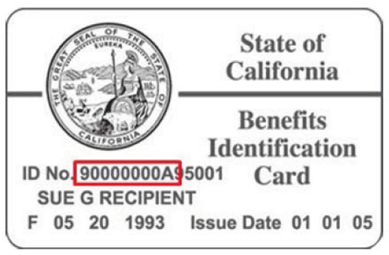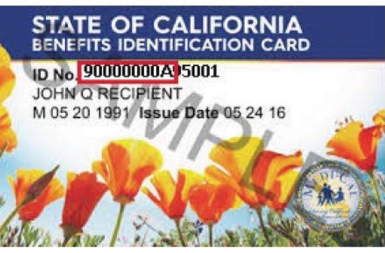 Unlike the MSPRP, registration is not required to access the Medi-Cal portal. All you need is your client’s name and Medi-Cal ID number. The ID number can be found on the member’s ID card and is comprised of the first 9 characters of the ID beginning with “9,” followed by 7 additional numbers, and ending with a letter. See exemplar benefits cards at right.