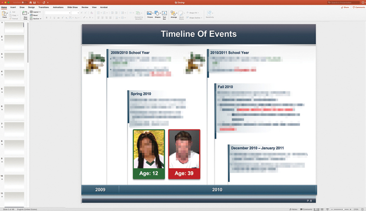 A Powerpiont timeline was created for a sexual harassment case (A.M. v. Pomona Unified School District), involving a 14-year-old student who was repeatedly sexually abused by her eighth-grade teacher. On numerous occasions teachers and the school principal failed to adequately supervise defendant or contact Child Protection Services to report the situation. After one of defendant’s co-teachers reported his inappropriate conduct, the principal assured the co-teacher that she and the district would take appropriate action, however, she and the district did nothing, allowing the defendant to continue his predatory conduct toward the student.