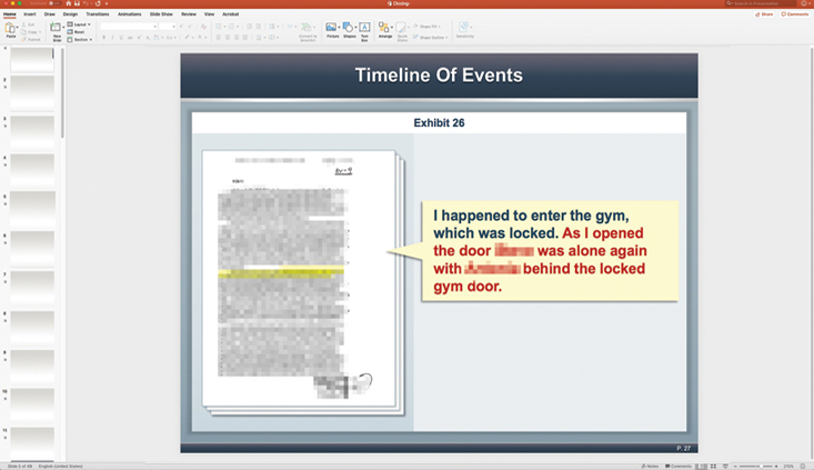 When preparing an effective PowerPoint timeline, you want to make sure your video deposition and transcripts are ready with highlighted pages and line designations to be inputted into the demonstrative. The excerpts you want to highlight, usually the deponent’s testimony, will be made into larger graphic callouts on the timeline. When you isolate callout words from dozens of pages of text, you get more focused eyewitness testimony that draws your audience’s attention on concentrated key facts of your case such as: “As I opened the door he was alone again with her behind the locked gym door.” (See Figure 1 courtesy of Motion Lit http://www.motionlit.com)