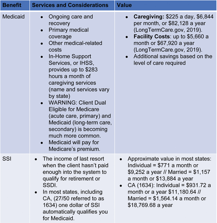 As outlined in Figure 1, Medicaid provides the highest value to a client, especially when the client has extensive care needs that require caregiving or skilled nursing services. In contrast to many other states, it is uncommon for a client with extensive care needs to receive the maximum of 283 hours of in-home caregiving hours every month in California. In many situations, these hours can be paid from Medi-Cal to a family member to help raise the household income, but this should be discussed with a qualified attorney or trust officer beforehand.