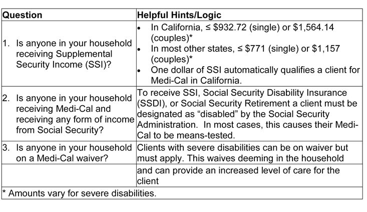 In contrast, clients on Medically Needy Medi-Cal are disabled and unable to work. Medically Needy Medi-Cal is means-tested (i.e., contains an income and resource test to be eligible), largely because it provides the most expensive services: long-term caregiving and skilled-nursing services. Clients often qualify for Medically Needy Medi-Cal if they receive a form of income from the Social Security Administration that requires them to already be determined disabled and are under the income and asset limits. Common examples of these forms of income include SSI, Social Security Disability Insurance (SSDI) and Social Security Retirement. A future application for these forms of income or an anticipated need for long-term care services often require considering the protection of this benefit.