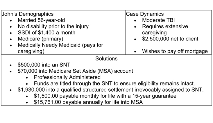 In-Home Supportive Services IHSS) grants John approximately nine hours a day of care payable to an external caregiver while his wife is at work. An SNT is established and will be used to pay his wife or additional caregivers for any care provided at night and on weekends (beyond IHSS hours). Since John will require a caregiver for the rest of his life, a structured annuity is purchased to ensure the longevity of caregiving funds.