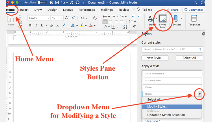 To start modifying styles, you need to open up the “Styles Pane.” On a Mac, the “Styles Pane” is located within the “Home” menu above your document. To find the button, you may need to expand the size of the window in order for all the menu items to appear. Once you locate it, click the button and the Styles Pane should open on the side of your word document. (See Fig. 1)