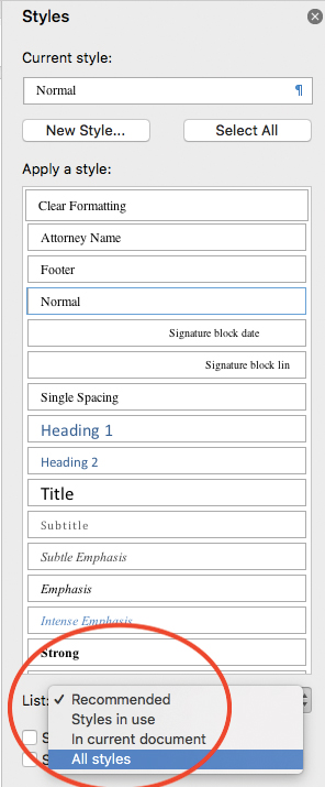 When the Styles Pane is open, you will see a list of a variety of different styles. However, Word hides a lot of the styles by default when you first open the Styles Pane. To fix this, you need to change the option setting to show you “All styles” rather than “Recommended” or “Styles in use.” On a Mac, there is a dropdown menu at the bottom of the Styles Pane that allows you to make the change. On Windows, you must click the “Options” button at the bottom of the Styles Pane, which opens a pop-up dialog window to make the change. (See Fig. 2)