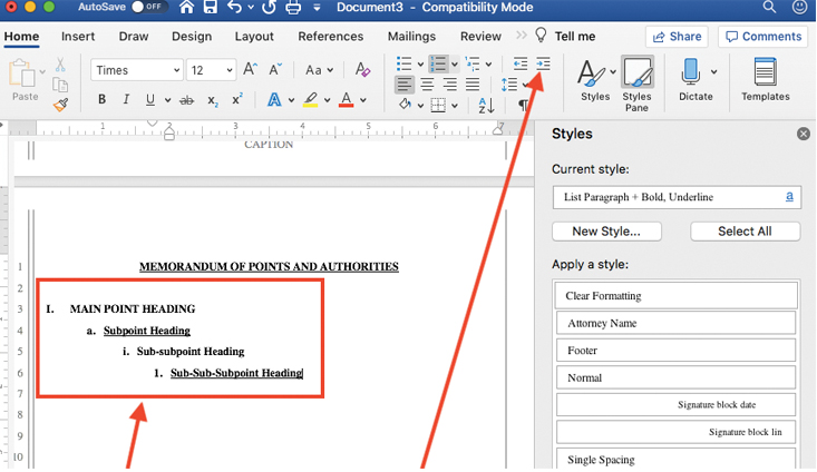 Begin by typing out “Memorandum of Points and Authorities” on the page and adjusting its formatting into the style you typically use for such a title. This is an important step, because any table of contents will need to list such a title even though it is not part of the point headings. After you have finished that step, hit “Enter” or “Return” and type out a letter or two on the next line. Select those letters and click the “Normal” style to make sure the text following the heading is in the “Normal” style. Once you have done that, you can delete the letters such that your cursor remains on the same line where you just had the letters.