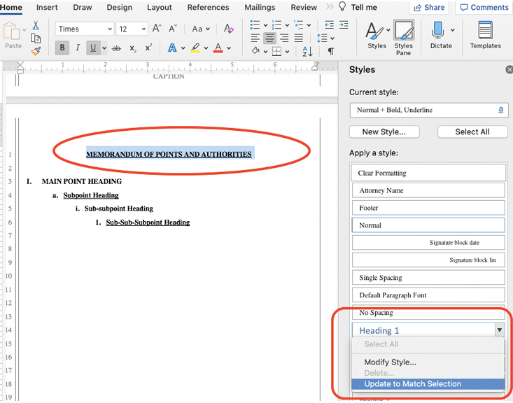 Once you have formatted your section title (e.g., Memorandum) and numbered list, you need to match the section title and each level of the numbered list to a corresponding “Heading” style. As mentioned above, you will want your section title to become part of the table of contents, which means that you need to assign the “Heading 1” style to match the section title rather than the first point heading. To do this, you simply follow the same steps you took when you originally updated the “Normal” style, but you update the “Heading 1” style instead this time. (See Fig. 5)