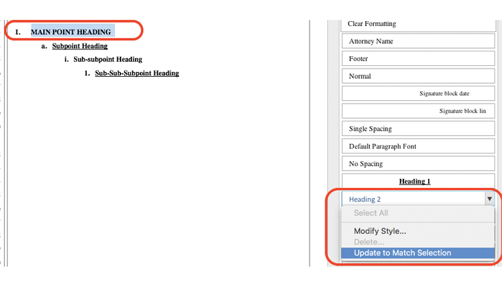 After updating the “Heading 1” style to match the section title, proceed to match each of the point heading levels to the next “Heading” style in order. For example, the “Heading 2” style should be updated to match the first main point heading (i.e., Roman numeral I), the “Heading 3” style to match the first subpoint heading, and so on. (See Fig. 6)