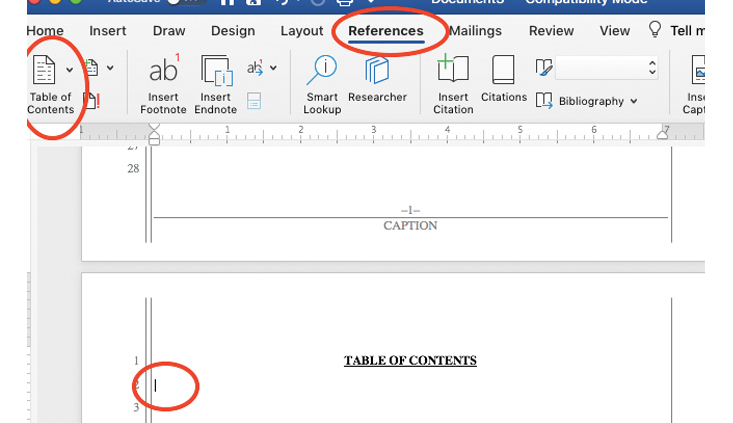 Once you have your “Heading” styles updated, it is time to test out the table of contents feature and make any necessary modifications to the “TOC” styles. Although you can erase the generic numbered outline you just created, you should leave it in place so that Word has something to build the table of contents from at this point.
