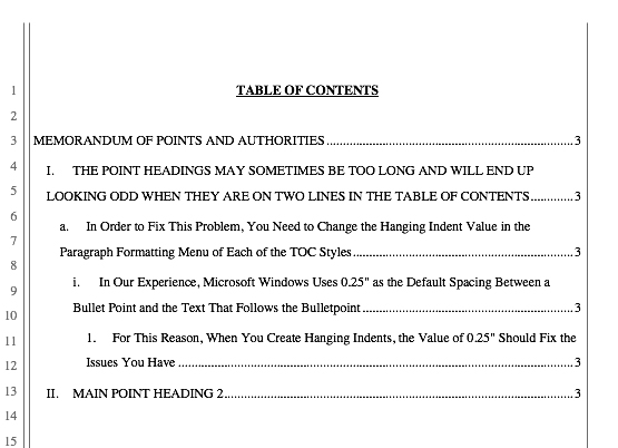 After you make the modification and click “OK,” the table of contents should paste directly into your document with each of the headings you defined earlier. If you did not type a lot into the generic headings you created earlier, then everything may look perfect to you. However, if the generic headings had the length of an actual point heading, then you will see a problem when the point heading spreads across two lines of the inserted table of contents. Specifically, the second line of a point heading will not be aligned with the first line in the table of contents. (See Fig. 9)