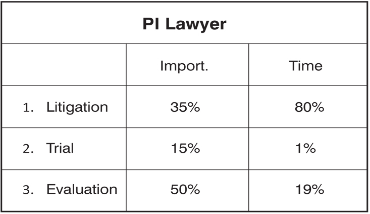 Also, the average PI lawyer spends a very small part of their time in trial versus the successful trial lawyer who spends an average of two months out of the year there, which makes them much more proficient. But the most important distinction emerges in this last category that I’ve dubbed “Evaluation.”