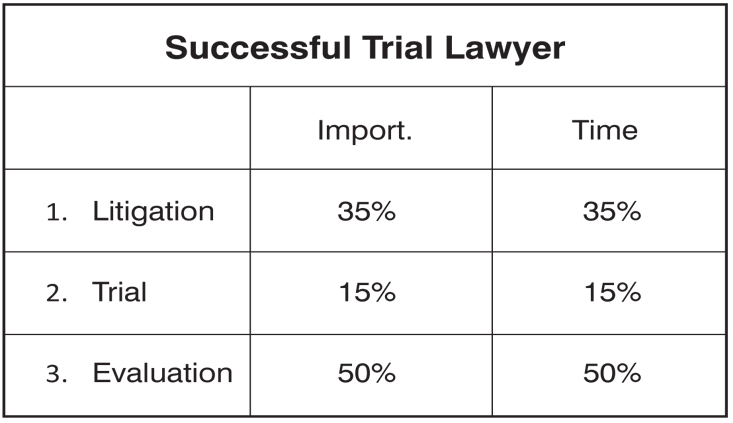 After years of pondering this, I began doing things differently in search of this skill set until I made a cathartic observation one day. I was spending half my office time in the conference room evaluating the next case I had set for trial. I would start by making a pile of things I knew the jury would believe and another pile of claims I knew were “iffy,” and then took it from there. I also observed that my time was spent doing one of three things, to which I assigned a percentage of importance based on how much influence I believed it had on the outcome of a trial. The product of this exercise resulted in the following: