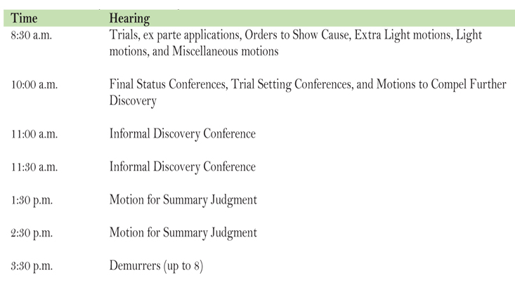 Hearings for law and motion matters are scheduled on the CRS. Each IC department programs its own CRS schedule for motions that will be heard on a daily basis. Find out if your judge requests that the parties provide courtesy copies of motion briefing.