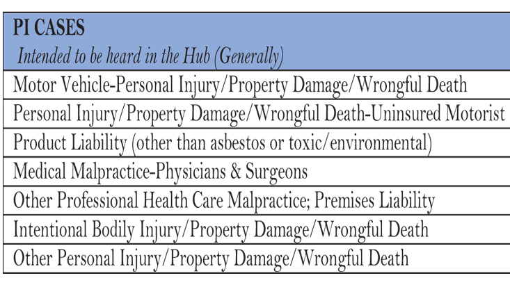 The types of cases assigned to the PI Hub are prescribed by Los Angeles County Court Rules, rule 2.3 (a)(1)(A), rule 3.23, and the Los Angeles Superior Court’s February 24, 2020 Standing Order, as shown in the chart.