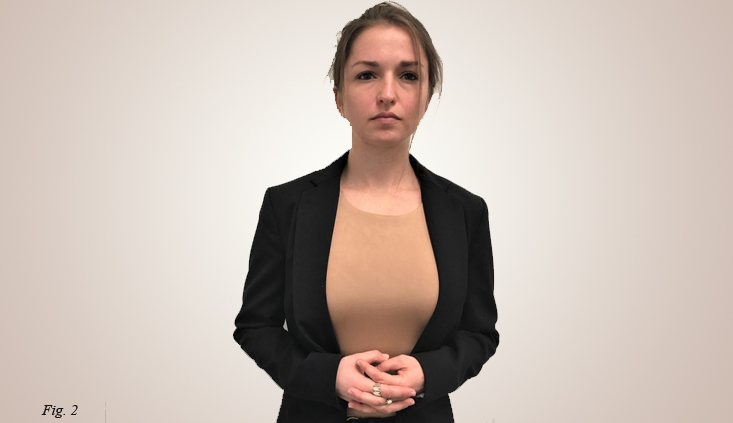 Johnson and Hunter as well as Bowden in Winning Body Language emphasize where and how the hands should be positioned when not gesturing. Bowden calls it the Truth Zone while Johnson and Hunter call it the Ready Position. The hands are directly in front of the waist. The hands loosely touch. There is a little bit of space that separates the forearms from the abdomen. (See Figure 2.) Although this may seem unnatural, it is the best place to gesture from. In this neutral position, the jurors may not even notice your hands. They will be focused on your eyes.