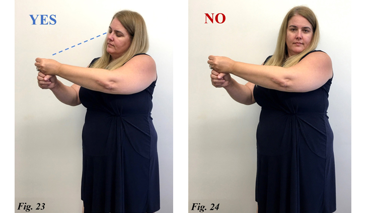 When using your hands or a model to demonstrate, the error attorneys often make is looking at jurors rather than looking at their hands. You want the jury to watch what you are demonstrating. If not, why are you demonstrating? When you look at the jurors the jurors will look at your face or your eyes. The solution is simple. Look at your hands when demonstrating with your hands. If you are using your hands to demonstrate the motion of two vertebral discs, look at your hands. Figure 23 shows the correct way to demonstrate. Figure 24 is the incorrect way to demonstrate. Before you look at the jury, stop talking, stop demonstrating, return your hands to your body and turn your body back to the jurors. To make this gesture natural, you need to practice.