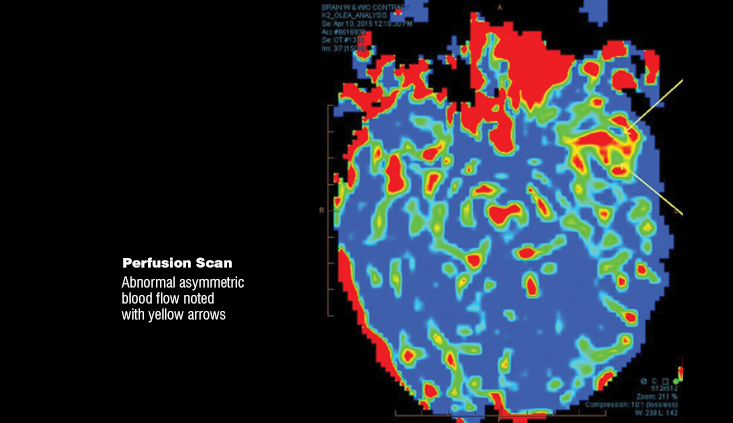 Injured areas of the brain may have reduced blood flow. An MRI perfusion scan measures blood flow in the brain using a contrast agent that is injected into the client’s bloodstream, creating a visual multi-colored representation of reduced blood flow to injured areas of the brain. Differences in blood flow between a non-injured hemisphere and an injured hemisphere of the brain can be made readily apparent to jurors.